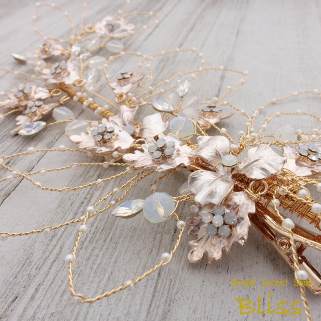 リーフの透け感、乳白色系のビジューの輝きはナチュラルな印象を与え