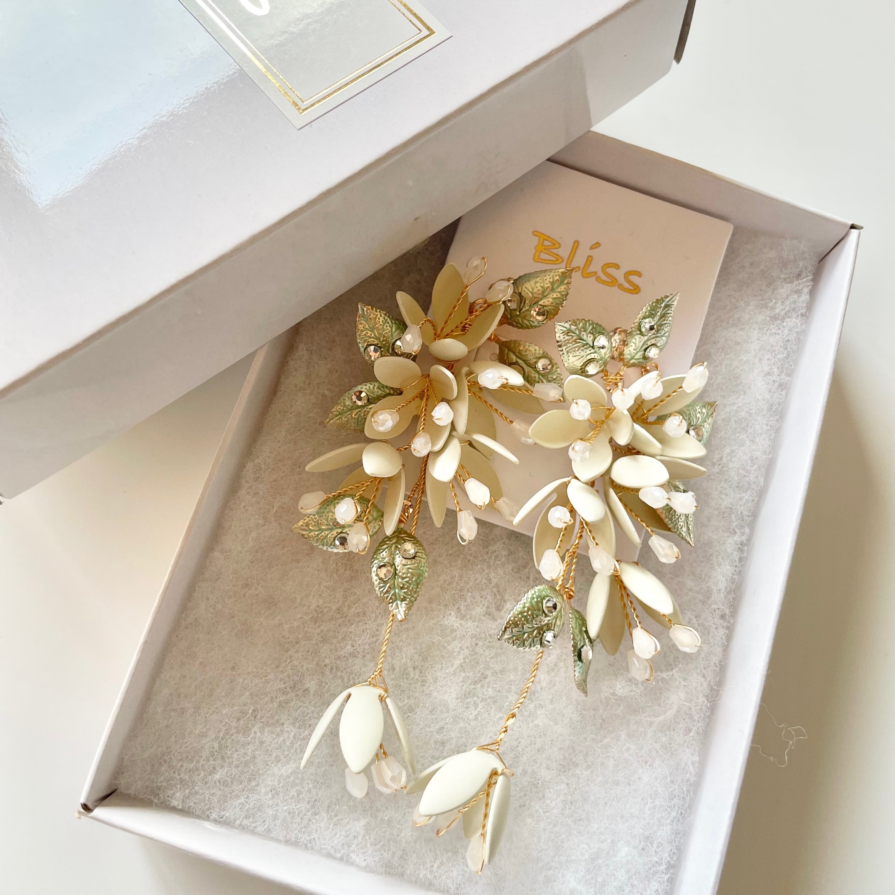 E-108 ウェディング アクセサリー【ホワイトフラワー &リーフ イヤリング(or ピアス選択)】ブライダル