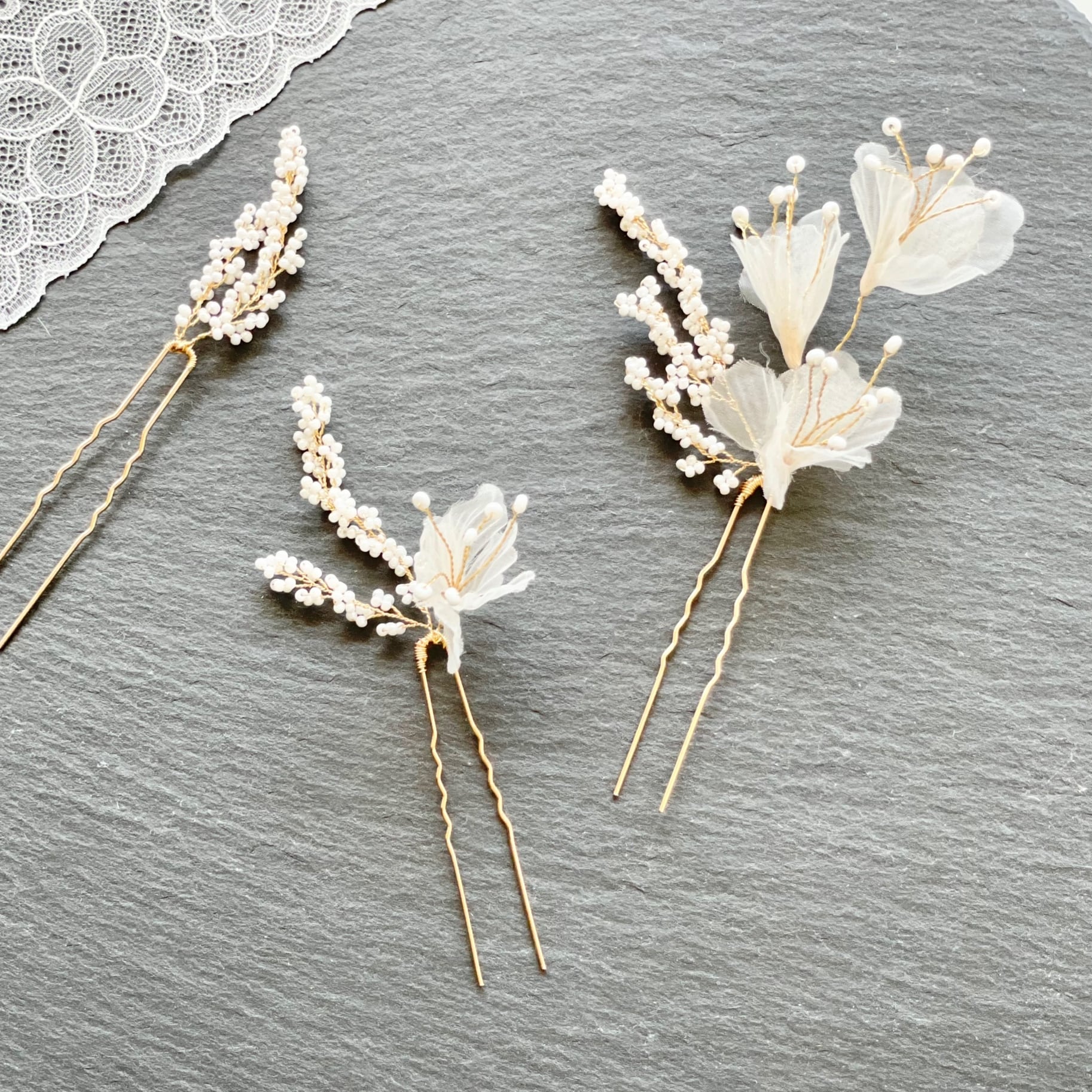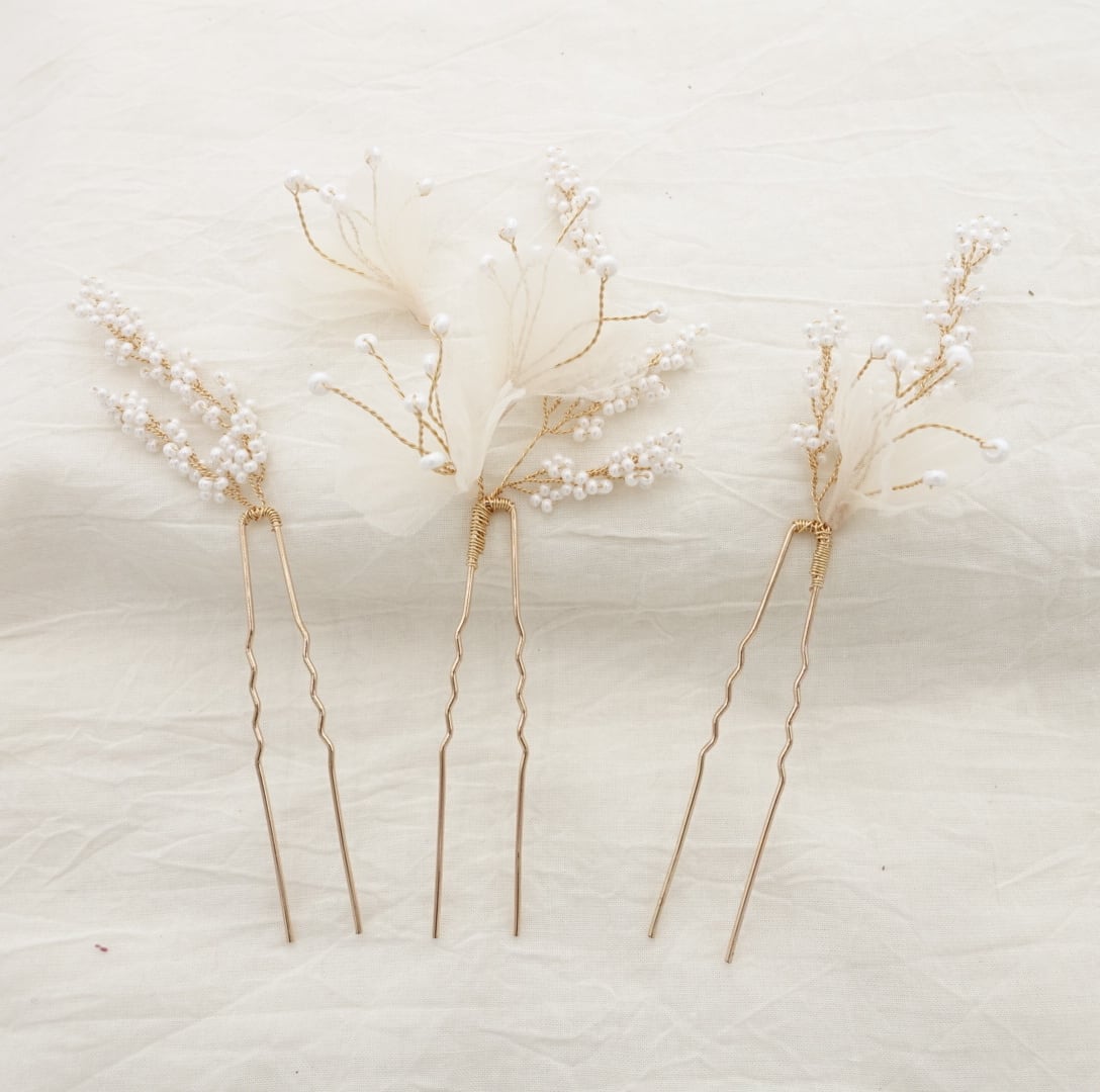 H-174 ウェディング アクセサリー【小枝 シフォン フラワー 3P ヘアピン】ブライダル 髪飾り