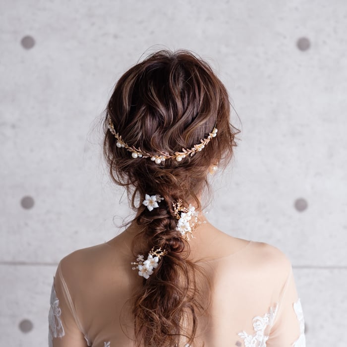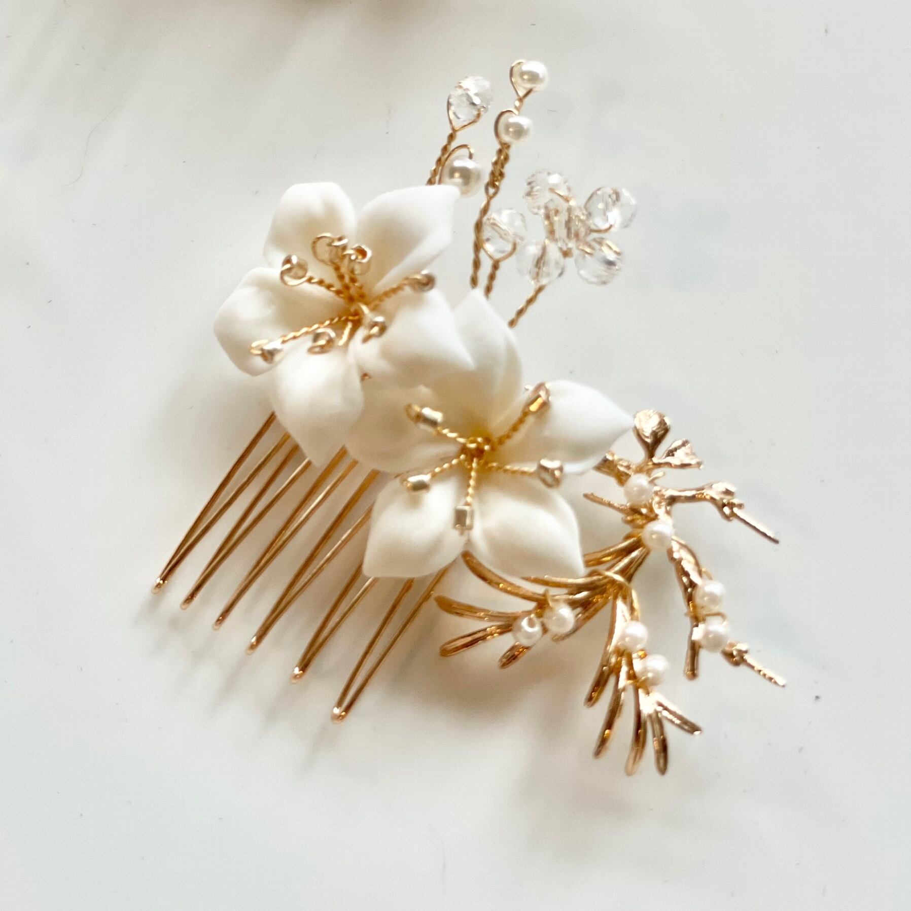 H-156 ウェディング アクセサリー【小枝 ホワイト フラワー&ブランチ 3P ヘッドドレス】ブライダル 髪飾り