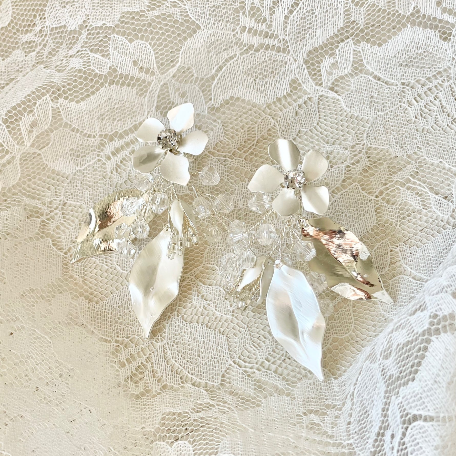 E-120 ウェディング アクセサリー【小枝 フラワー&リーフ プラチナシルバー イヤリング】